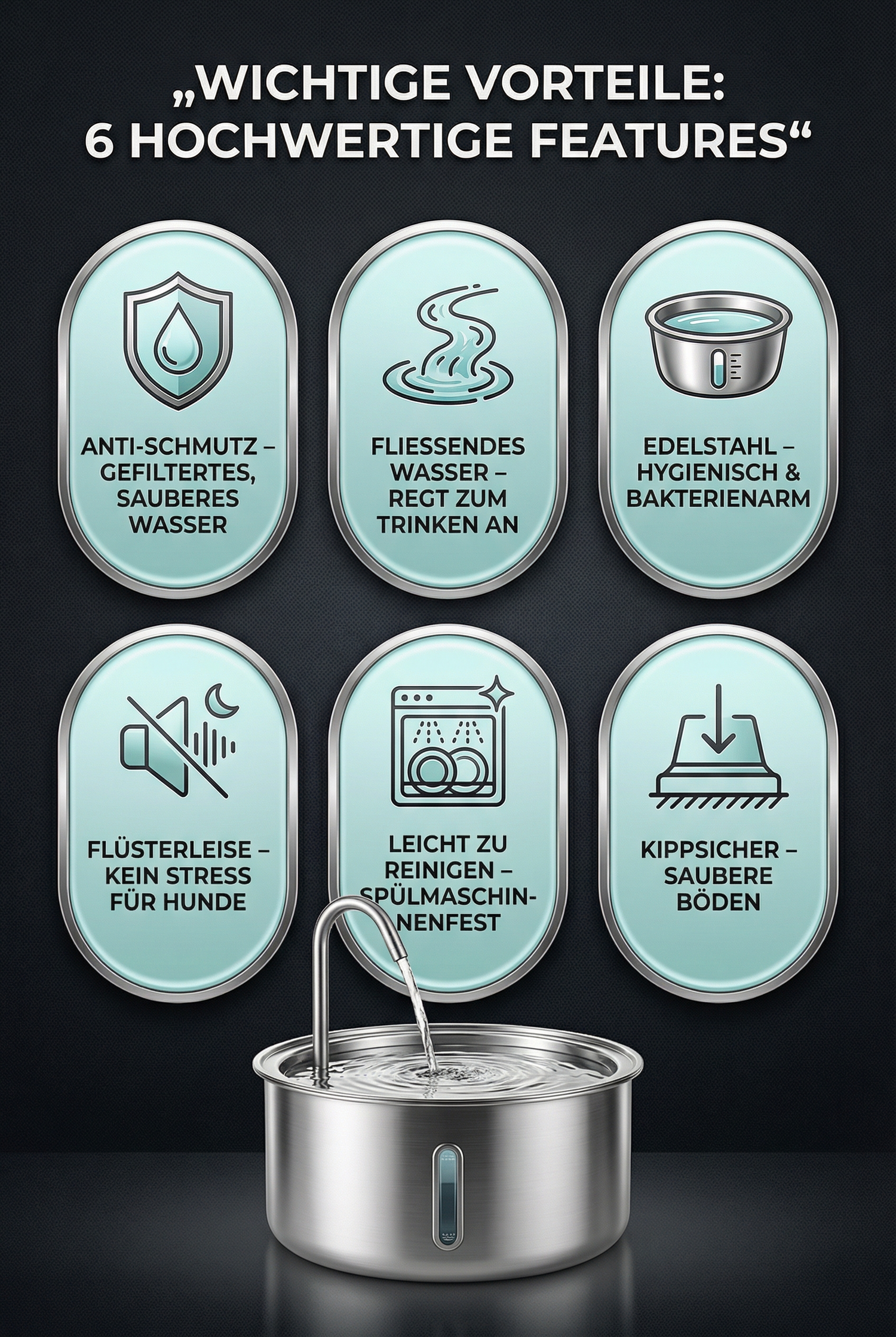Die hygienische Edelstahl-Oberfläche hilft, Schleim und Keimbildung zu reduzieren, während das Wasser frisch und angenehm kühl bleibt, den ganzen Tag.