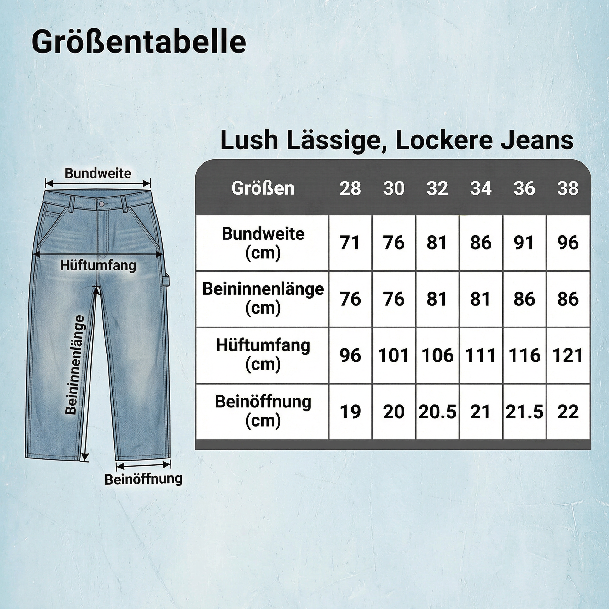 Die Jeans ist größengerecht. Wenn Sie zwischen zwei Größen liegen, empfehlen wir die größere Größe für einen besonders lockeren Sitz.