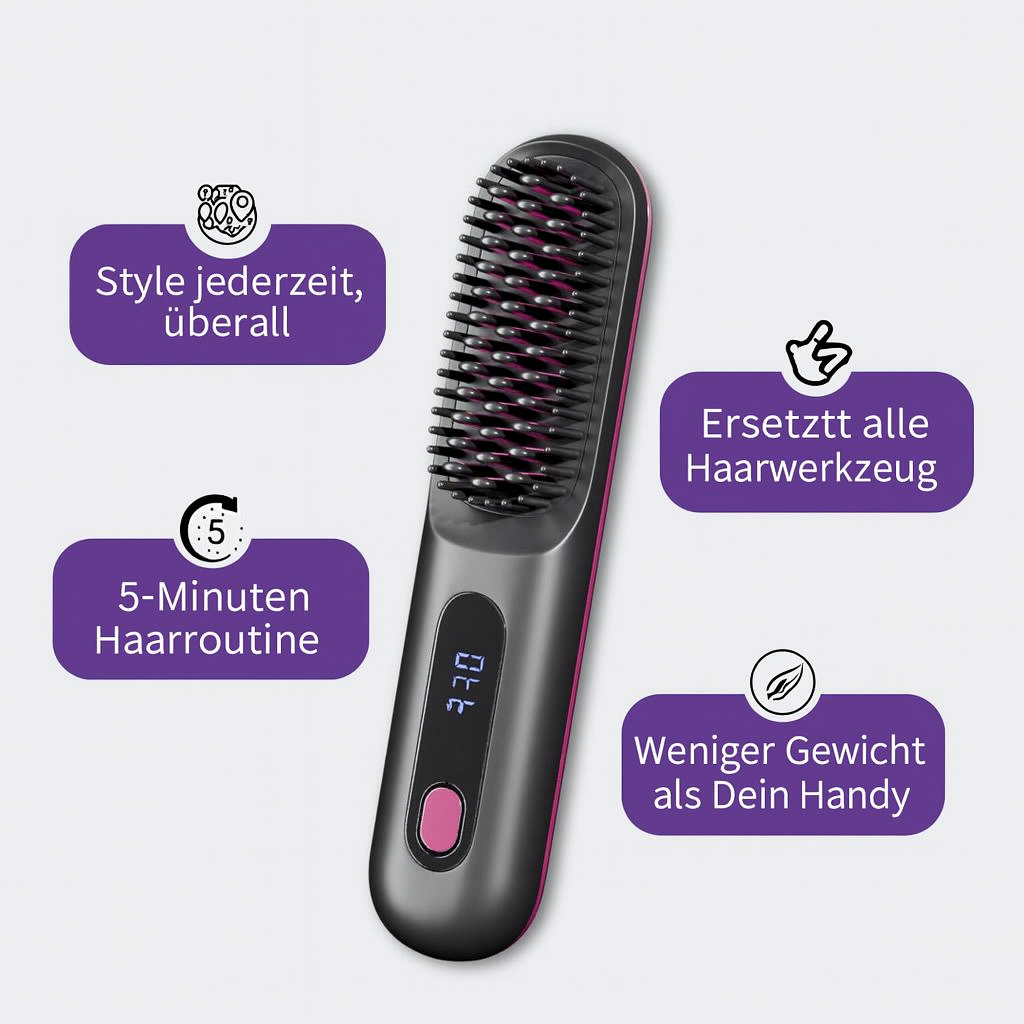 Unsere Lösung: Die Tragbare Glättungsbürste™ Ihr unverzichtbares Haarstyling Gerät für unterwegs, mit dem Sie Ihr Haar jederzeit stylen können.